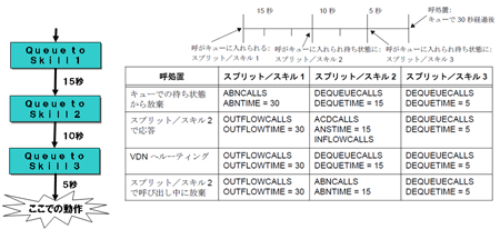 このフローでは、まず、スキル1へキューイングします。そして、15秒後にスキル2へキューイング。さらに10秒後にスキル3へキューイングしています。そして、そこから5秒たったとき、つまり、全体で30秒経過したあとに、「放棄・スキル2で応答・他のVDNへルーティング・スキル2のエージェントに着信中に放棄された」ときに、スキル1・スキル2・スキル3には各々どのような統計がされるかを示しています。